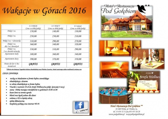 Hotel i Restauracja Pod Gołębiem** znajdujący się w samym centrum zachęca do spędzenia wakacji w malowniczej Wiśle.